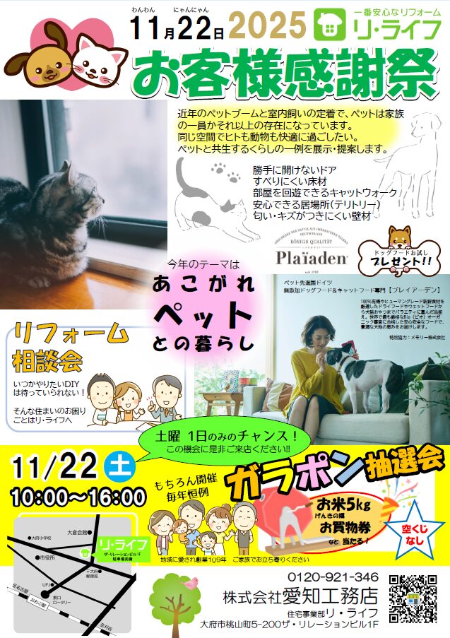 11/22 リ・ライフお客様感謝祭開催のお知らせ 2025.11.20 category:お知らせトピックスニュースリリース毎年の恒例となっております、住宅事業部お客様感謝祭を2025年11月22日(土)に住宅事業部店舗「リ・ライフ」にて開催します。皆さま是非お越しください。